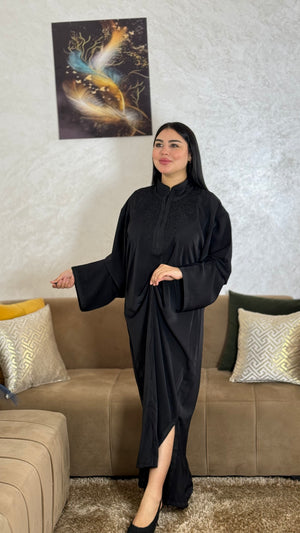 Ce caftan se distingue par ses finitions soignées, ses manches élégantes avec broderies raffinées et sa coupe fssala mekhzanya qui met en valeur la silhouette avec classe et simplicité.